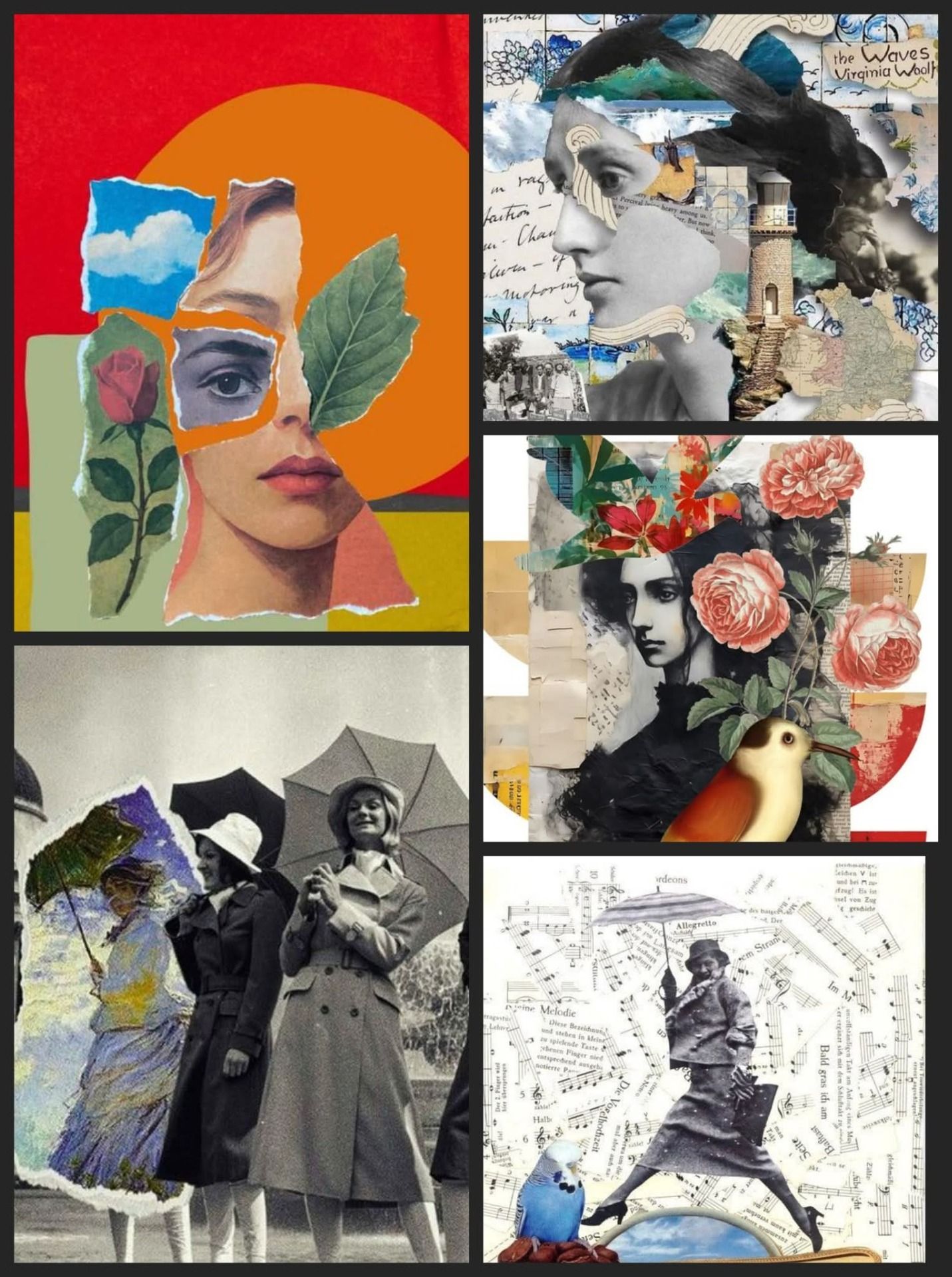 Réalisation d'un ou plusieurs collages pendant l'atelier, collage intuitif, et poètique.